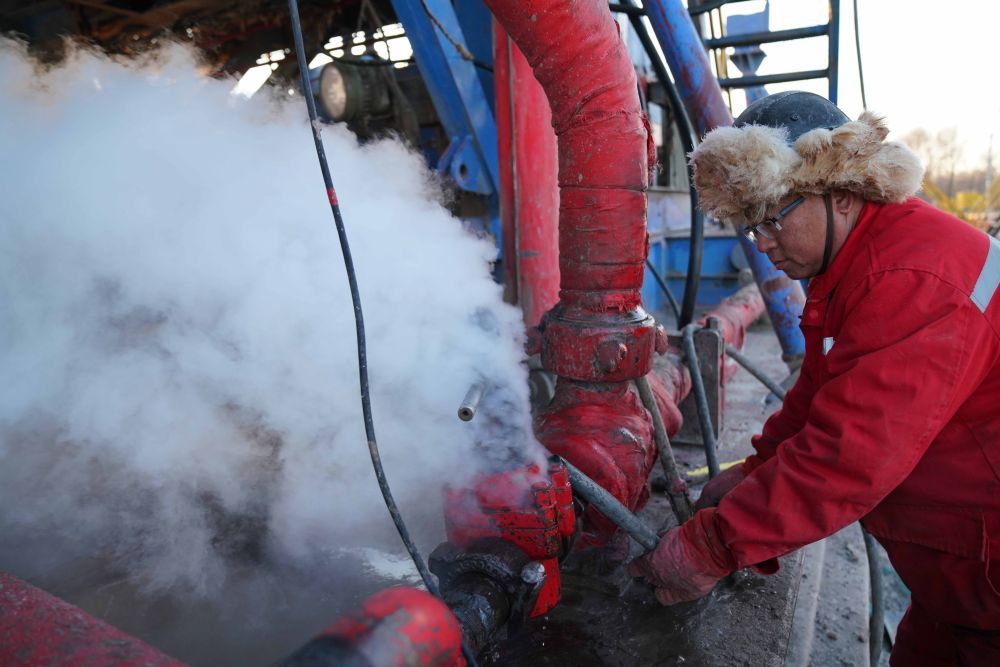 2020年12月28日,野外的大庆油田1205钻井队钻井平台,气温低至零下20多摄氏度,寒风呼啸,滴水成冰。鲜艳的党旗下,队员们在严寒中作业,战疫情、保生产,这支“铁人”王进喜带过的队伍一如当年。