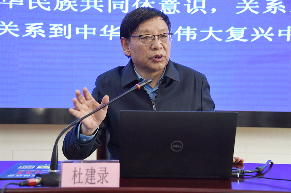 杜建录指出,中华民族是由中国各民族组成的共同体,在中国五千年文明史上,中华民族共同体经历了自在、自觉、自强三个阶段。他用大量的史实资料,充分的历史依据,阐明了中国辽阔的疆域是各民族共同开拓的、中国悠久的历史是各民族共同书写的、中国灿烂的文化是各民族共同创造的、中国伟大的精神是各民族共同培育的,并强调要贯彻落实中央民族工作会议和自治区十二届十三次全会精神,坚持正确的中华民族史观,建立铸牢中华民族共同体研究体系,深化中华民族共同体重大基础性问题研究,加强中华民族共同体团队建设,形成完整的史料体系、话语体系、理论体系。
