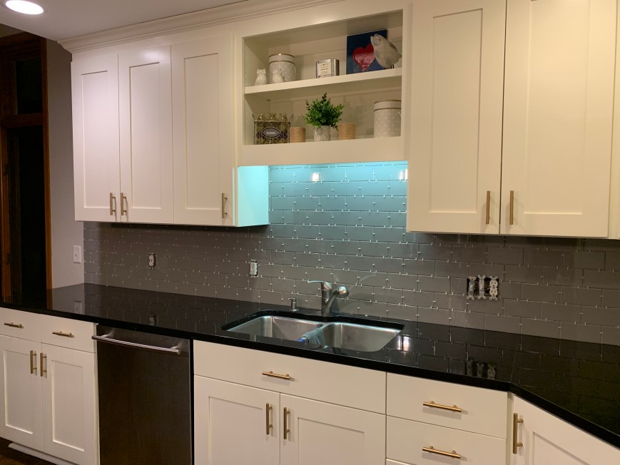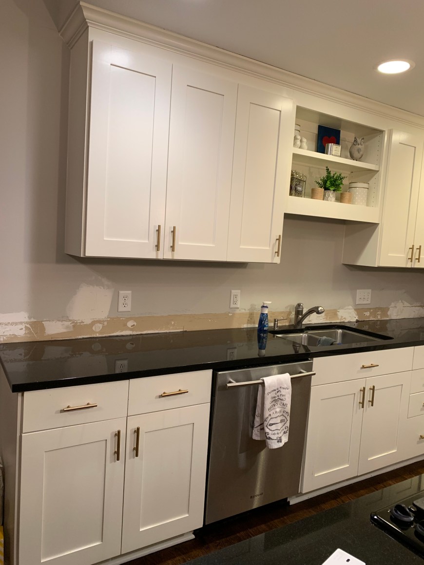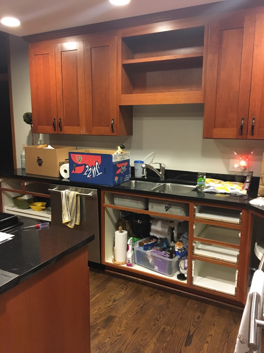 The very first thing we did when we moved into YDW 2.0 in June 2017 was to have the kitchen cabinets painted the same color white and the island the same color gray as YDW 1.0. The kitchen had been remodeled and updated by the previous owners with beautiful cherry cabinetry but that style just wasn’t right for us.