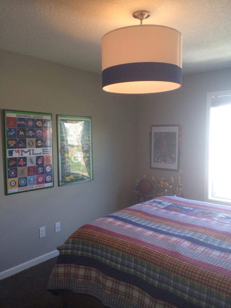 We decided to start with Owen and Logan’s room and a trip to Ikea proved valuable. They had huge drum shades that we’d seen before and I thought it could work for their room. We picked up two of them for a mere $29.99 each plus what we thought was the lighting adapter for another $10.00. The drum shade has Velcro and a piece that it easily wraps around. Upon our set up at home, Ben realized we didn’t get the right adapter piece but leave it to him to come up with an alternative. He used the lighting part of our original island lights and worked his magic to create a great new look in their rooms. Light Brite never gets old, I guess.